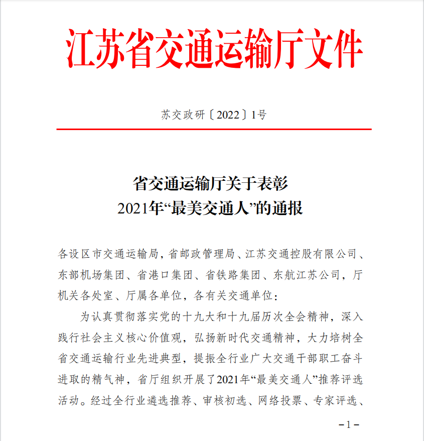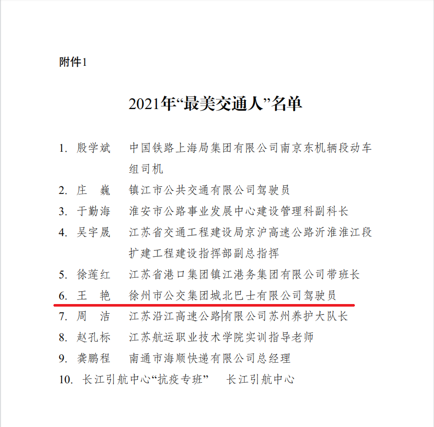 近日,江蘇省交通運(yùn)輸廳下發(fā)《省交通運(yùn)輸廳關(guān)于表彰2021年“最美交通人”的通報》,徐州公交集團(tuán)公交車駕駛員王艷榮獲“最美交通人”稱號。