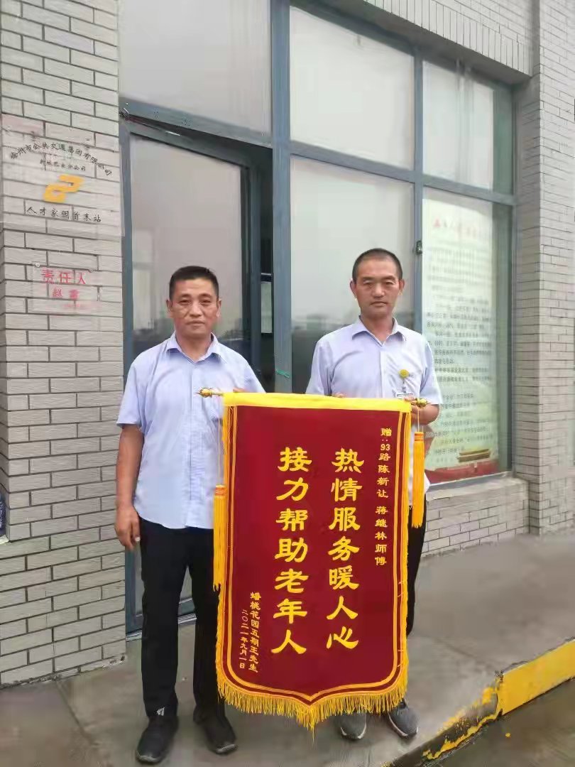 9月1日下午,在蟠桃花園站臺(tái)站有一位年邁的老人,手里緊緊握著一面書有“熱情服務(wù)暖人心,接力幫助老年人”的錦旗,在雨中等待著93路駕駛員陳新讓、蔣繼林的車輛,想要把這面飽含誠摯謝意的“禮物”親手送給兩位師傅。