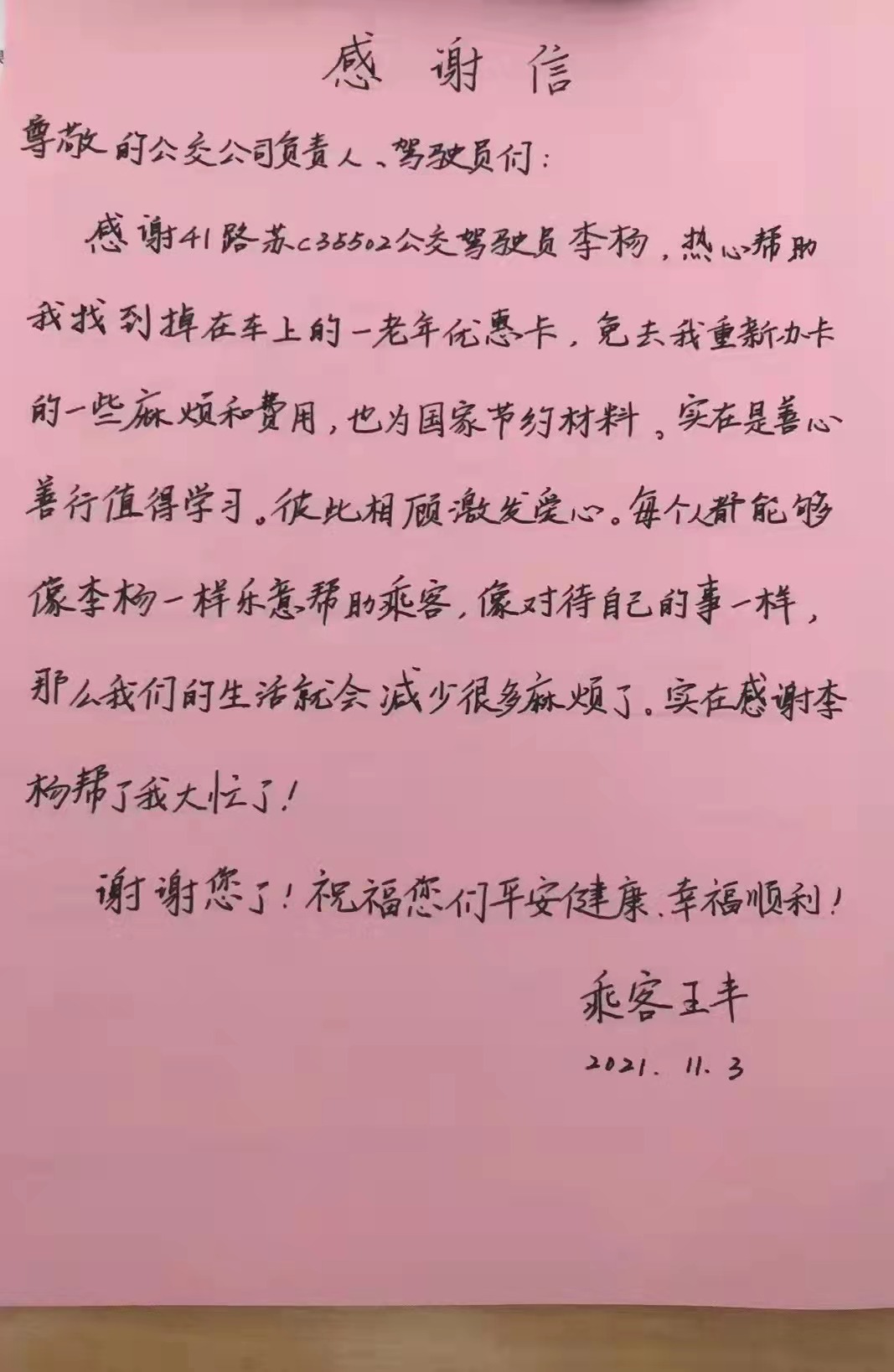 新區(qū)公司駕駛員李楊駕駛41路蘇C35502號(hào)車,行駛至銀湖小區(qū)站臺(tái)時(shí),乘客王女士向其求助。王女士告訴駕駛員,早晨10點(diǎn)20分左右,她乘坐41路公交車時(shí),不慎將老年優(yōu)惠卡丟在了車上,希望李楊幫她尋找一下。李楊留下了王女士的電話,待車輛到達(dá)建筑學(xué)院后,李楊立即去調(diào)度室尋找,根據(jù)王女士提供的乘車時(shí)間很快鎖定了車輛,經(jīng)詢問(wèn),王女士的老年優(yōu)惠卡已被駕駛員交到了調(diào)度室妥善保管。11月3日下午,王女士取回了失而復(fù)得的老年優(yōu)惠卡,并送來(lái)感謝信。