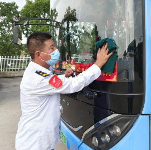 在淮海文博園公交樞紐站內(nèi),81路駕駛員謝新建正在車廂內(nèi)消毒,中午的車場經(jīng)過烈日炙烤,地表溫度有50多度,為了能給乘客提供一個(gè)舒適、安全的乘車環(huán)境,謝新建每班發(fā)車前都會提前上車檢查車輛設(shè)施設(shè)備、將車廂內(nèi)外打掃干凈,提前打開空調(diào),身上衣服濕了又干、干了又濕······