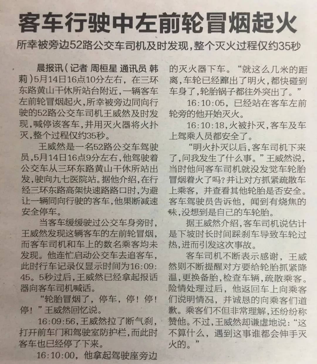 5月14日16點10分左右,在三環(huán)東路黃山干休所站臺附近,一輛客車左前輪冒煙起火,所幸被旁邊同向行駛的52路公交車司機王威然及時發(fā)現(xiàn),喊停該客車,并用滅火器將火撲滅,整個過程僅約35秒。