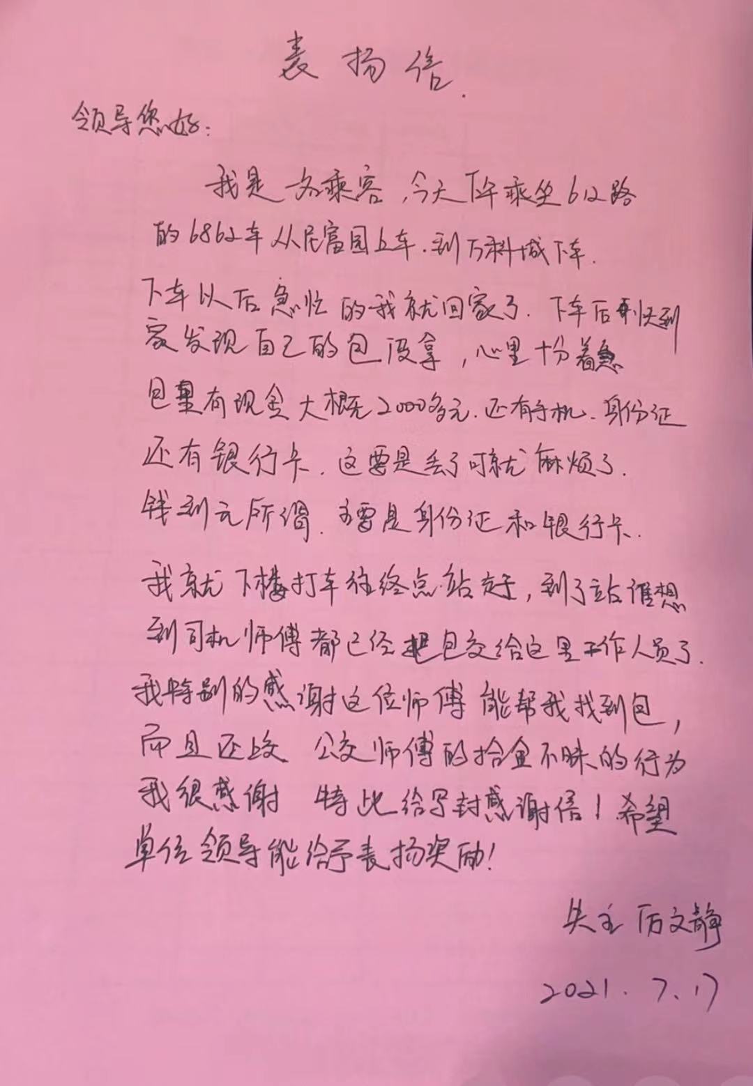 “到家后,我發(fā)現包不見,于是抱著試試看的心態(tài),來到九里停車場調度室詢問,沒想到好心的公交司機幫我找到了。”厲大姐緊握王師傅的手連聲致謝,當場寫下了一封表揚信。