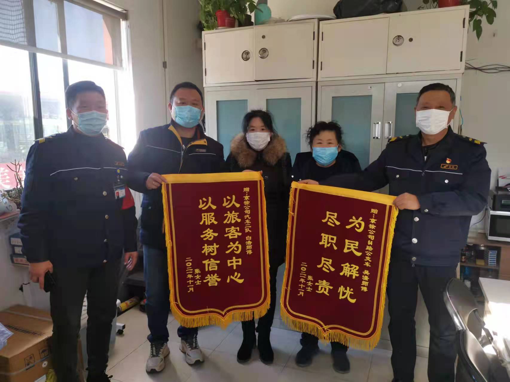 11月11日上午,乘客張女士帶著兩面錦旗來到食品城車隊(duì),感謝64路駕駛員吳瀟和現(xiàn)場調(diào)度白浩。