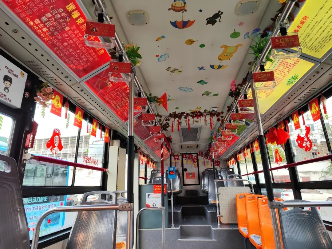 50余輛主題宣傳車車廂內(nèi)以中國紅為主色調(diào),在扶手、廣告展板、車廂尾部等醒目位置布置了黨的二十大報告內(nèi)容,還對黨的二十大報告以“數(shù)”讀、一圖速覽的形式,尤其是對二十大報告里黨的中心任務(wù)等重要提法、二十大報告金句等內(nèi)容做了重點(diǎn)展示。一幅幅主題鮮明、引人入勝的宣傳展板呈現(xiàn)在市民乘客面前,方便公交職工在工作間隙、廣大市民在乘車途中充分利用碎片時間學(xué)習(xí)黨的二十大精神。此外,部分公交車上還配置了“便民服務(wù)箱”,備有應(yīng)急藥品、口罩、消毒濕巾等,以實(shí)際行動踐行黨的二十大精神。
