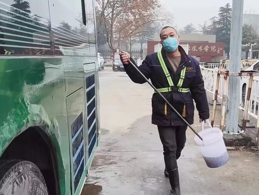 春運(yùn)期間,為保障廣大市民乘客出行需求,部分公交線路縮短了發(fā)車時(shí)間,增加了運(yùn)營(yíng)車輛,再加上客流增多,路面擁堵等情況,公交車回到終點(diǎn)站停放的時(shí)間很短,又要投入到下一趟的運(yùn)營(yíng)當(dāng)中,這無疑給車輛保潔工作帶來了一定的困難。因此,為確保出場(chǎng)車輛干凈整潔,每天天沒亮,張璞已經(jīng)在建筑學(xué)院停車場(chǎng)里忙起來了。只見他一手拿毛刷,一手拎水桶,開始清潔車廂外部,張璞動(dòng)作嫻熟地擦拭前擋風(fēng)玻璃、車廂外部?jī)蓚?cè),不一會(huì),他的臉上就已掛滿了汗珠,平均一輛車10分鐘的清潔時(shí)間,是他十多年工作鍛煉出來的速度。近日氣溫驟降,持續(xù)有冰凍天氣,如果抹布太濕,早晨擦座椅時(shí)會(huì)粘在上面,為此張璞都會(huì)提前準(zhǔn)備好潮濕的抹布,既能擦掉扶手、座椅、靠背上的浮塵,還不會(huì)留下水漬。像這樣日復(fù)一日的簡(jiǎn)單工作,張璞堅(jiān)持了十多年,他平均每天要打掃23臺(tái)車,平均一輛車10分鐘的清潔時(shí)間,張璞用自己的勞動(dòng),換來了車輛的干凈整潔。
