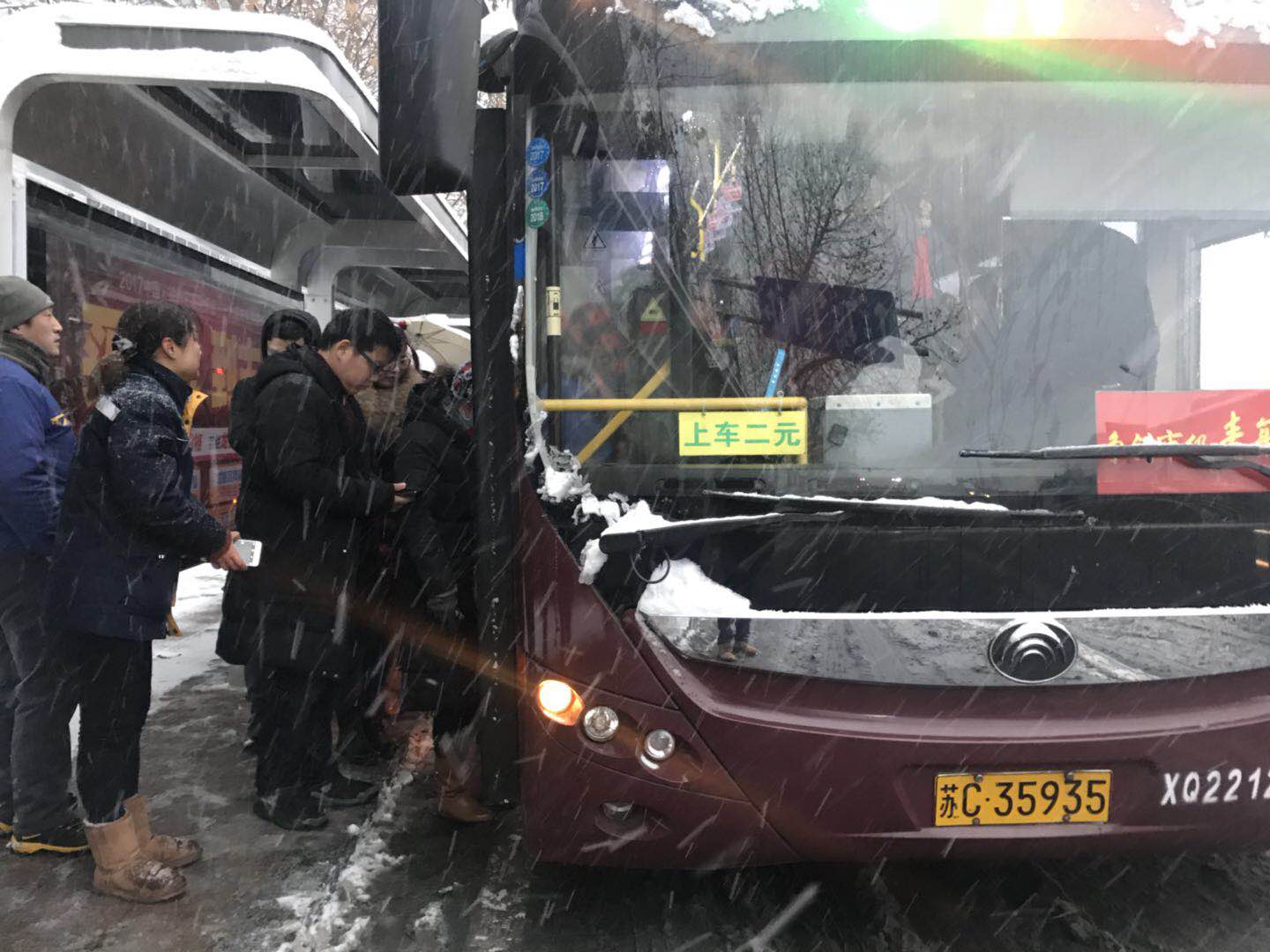 路況復雜的郊區(qū)及農(nóng)工線路由經(jīng)驗豐富的駕駛員駕駛并隨車配備一名安管人員,做好安全防范;7點多早高峰,在東站副廣場、金地、浦發(fā)銀行、二院、供銷等市區(qū)客流較大的站點,服務(wù)督導隊員和管理人員一起指揮車輛有序進站、疏導乘客安全乘車;駕駛員、保潔員和管理人員齊上陣,頂著嚴寒及時清理車前后門踏板、風擋、后視鏡積雪,及站臺、車輛通道等處積雪,防止乘客滑倒。