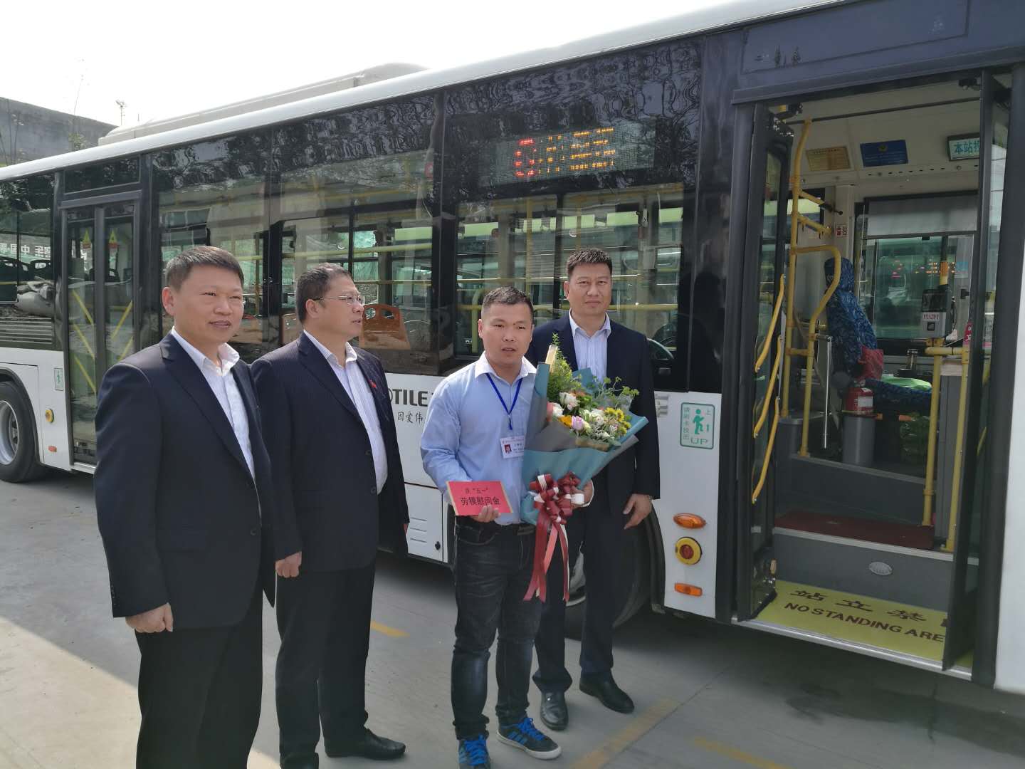 杜紅軍一行首先來到韓山終點站,剛行駛完一趟的市勞模、49路線駕駛員王博正利用休停時間打掃車輛,杜總走上前親切地與王博握手,并把一束嬌艷芬芳的鮮花和勞模慰問金送到他手中。