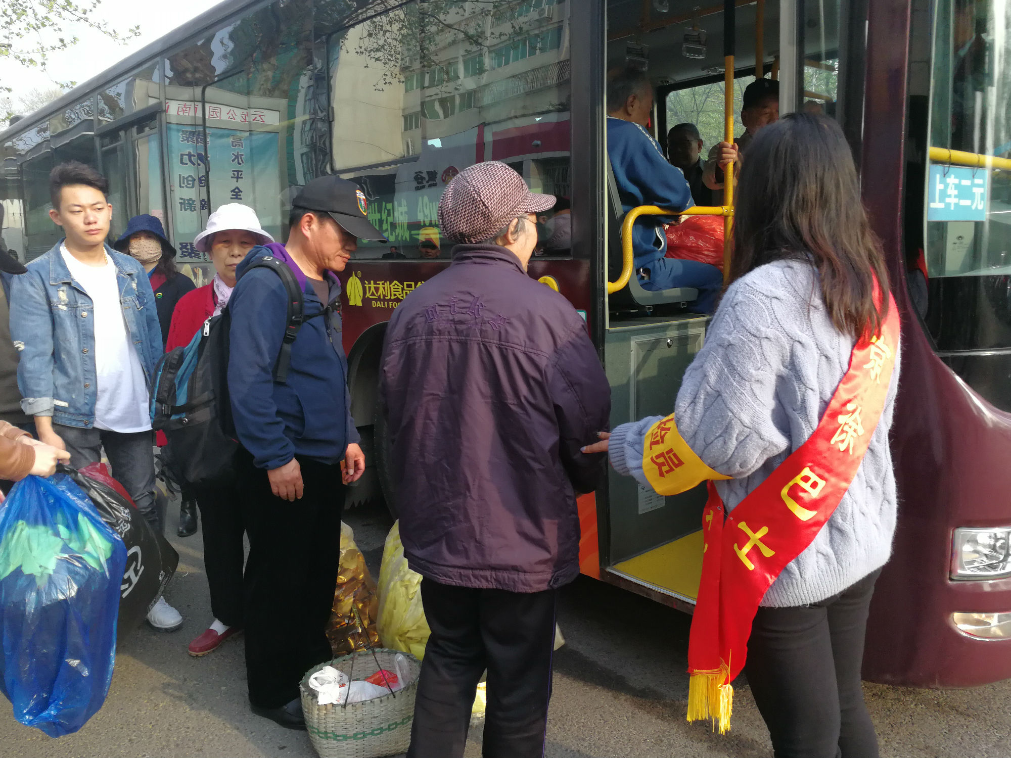 云龍公園南門,站滿了拿著大包小包的乘客?!按蠹遗藕藐牐⒁獍踩?,不要擁擠,需要換零錢的乘客可以到零幣兌換處換取零錢?!敝驹刚呶⑿χS持現(xiàn)場秩序。人群中有位提著兩個大包裹的大媽,志愿者走到大媽跟前,關(guān)切地詢問:“大媽,我來幫您把包裹拿上車吧?!敝驹刚咭皇謹v扶老人上車,一手拿著物品,為其安排好座位并叮囑大媽注意安全。一班車走后,還沒撈著喝口水,現(xiàn)場又聚滿了乘客,志愿者們又開始忙碌起來:“大爺,車還要一會才能來,您先坐這歇一會吧。”志愿者拿來板凳,讓老大爺坐下休息,老大爺十感動,說道:“你們真貼心。
